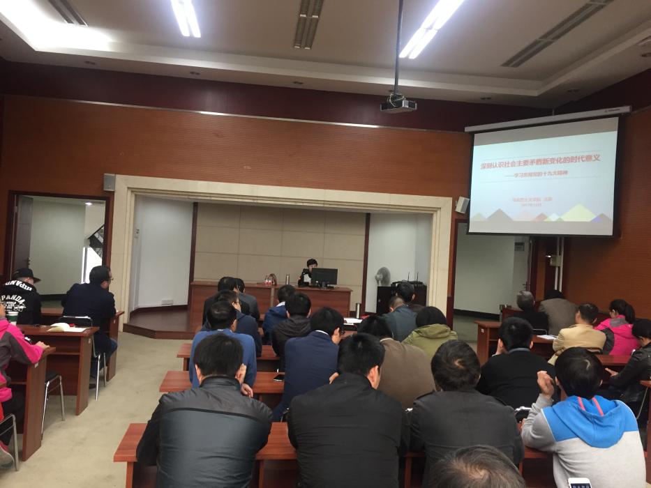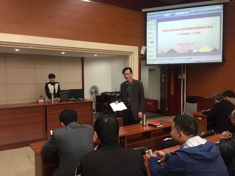 学习贯彻党的十九大精神宣讲团”成员汪澎老师宣讲十九大精神。本次宣讲的地点是九里校区1号综合楼240学术厅,宣讲的主题是《深刻认识社会主要矛盾新变化的时代意义—学习贯彻党的十九大精神》,力学学院全体教职工认真聆听了此次讲座。本次宣讲由学院党委金建明书记主持。