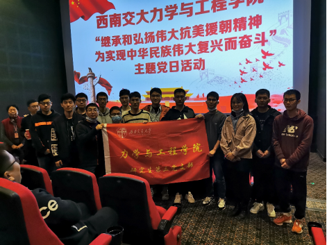 为纪念中国人民志愿军抗美援朝出国作战70周年,加强爱国主义教育,厚植爱国主义情怀,力学与工程学院学生党支部在学院党委的组织下20201030日下午14开展了“继承和弘扬伟大抗美援朝精神,为实现中华民族伟大复兴而奋斗”的主题党日活动,全体党员集体观看了国家电影局为纪念抗美援朝70周年的重点影片《金刚川》。