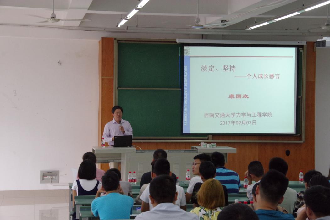 最后,学院院长康国政教授介绍了自己的求学经历、感悟以及科研工作,用自己的亲身经历给新生上了入学第一课。勉励同学们好好学习,将基础打扎实,为自己创造更多机会。同时要懂得将各方面知识融会贯通,形成自己的思维体系。并且要懂得实践的真理,将自己的知识运用在实践中。康院长希望同学们珍惜现在着眼未来,做一个有准备的人,注重合作与交流;无论何时谨记淡定、坚持,方得始终。
