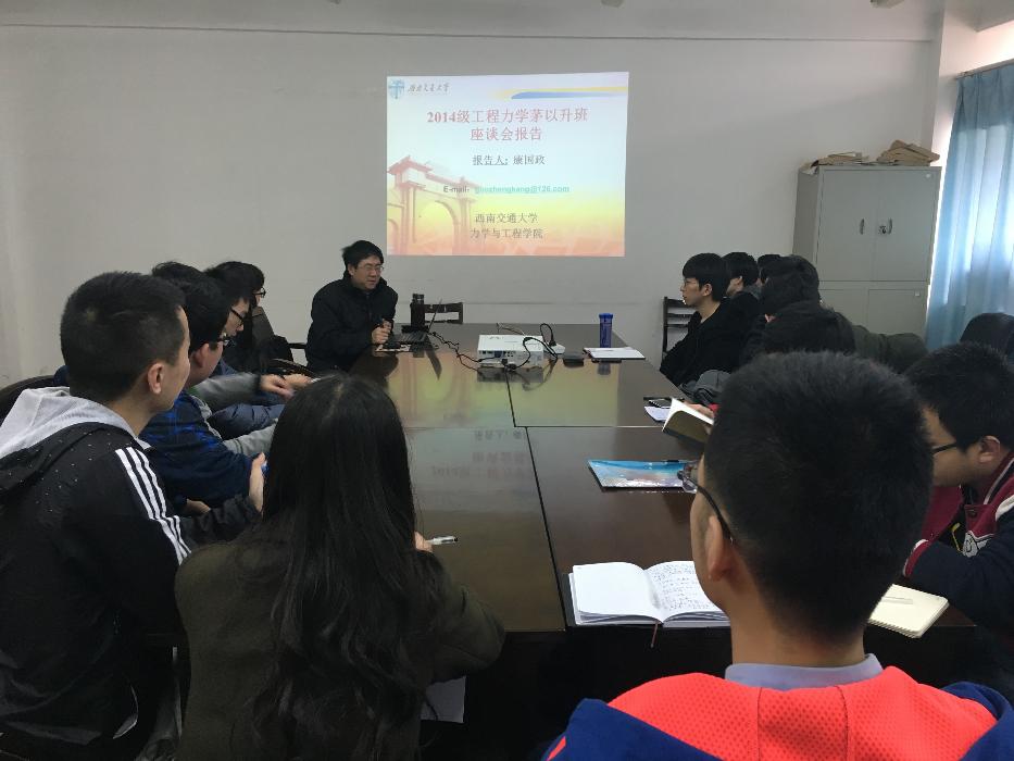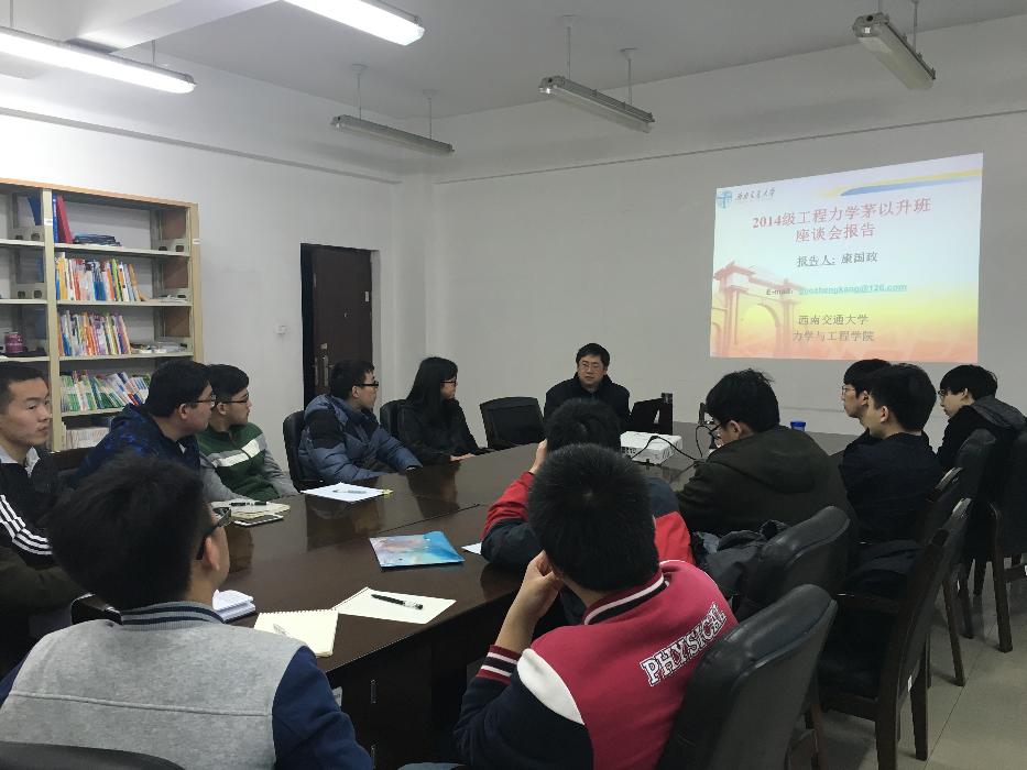 201733,工力2014级茅班座谈会在X2307举行,出席本次会议的有2014级茅班班导师金建明书记、学院院长康国政教授、2014级茅班学生。