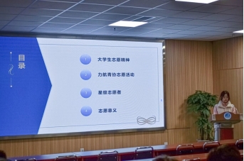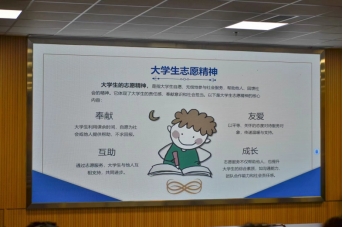 首先,主持人详细介绍了大学生志愿精神的核心内容,包括奉献、友爱、互助和成长,鼓励志愿者们通过课余时间不求回报为社会中有需要的人提供帮助与服务。