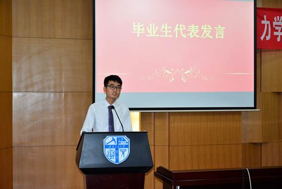 授书仪式之后,优秀毕业生代表许磊同学上台发言。许磊同学从成长和回忆两方面谈了大学四年的收获,并表示人生有无限的可能,最重要的就是超越自我。接着,他为同学们送上美好的祝福,希望同学们能继承大学生活中最自由的思想,永远激荡着青春的豪情,永远放肆着不羁的灵魂。