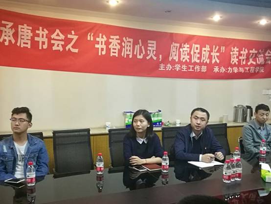 学生工作部主办,力学与工程学院承办的承唐书会之“书香润心灵,阅读促成长”读书交流会,在九里校区1号综合楼会议室顺利举行。此次活动由郭春燕同学和郑双星同学主持,并邀请了产业处综合管理科副科长周永生老师以及院团委副书记、研究生辅导员张英蓉老师担任嘉宾。