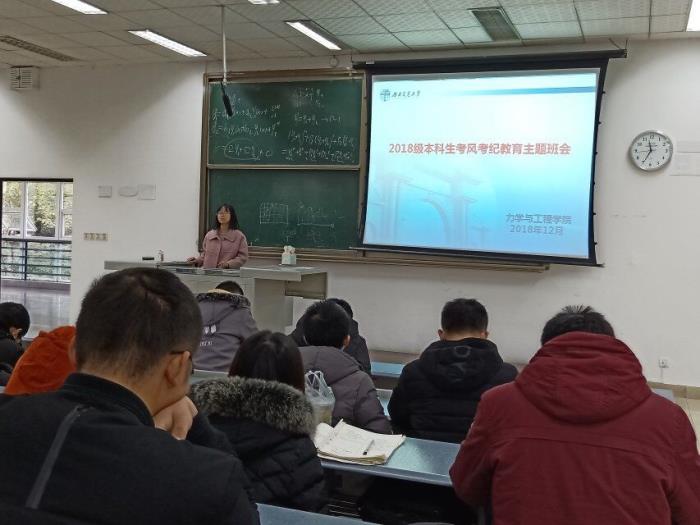 本学期期末考试即将临近,为加强考风考纪教育和安全防范意识,2018年12月25日17:30,学院2018级本科生在X1315教室召开诚信考试主题班会。