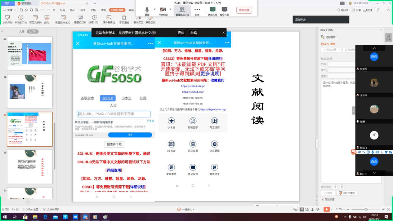 接着,大家围绕“宅家学习”期间的科研方法及成果,结合本班处于硕士一年级的实际情况,对文献搜索和外文文献阅读技巧进行了深入讨论和互相交流。一些同学提出了自己当前遇到的科研问题,班级同学共同热心的帮助解答,并分享了相关学习资源。