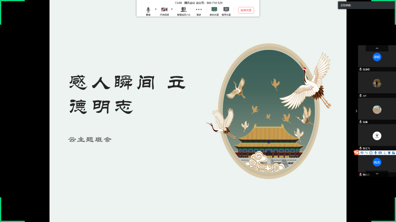 为深入学习贯彻习近平总书记关于新冠肺炎疫情防控工作系列重要讲话精神,落实《新时代爱国主义教育实施纲要》文件精神,对标研究生培养质量提升和学校“双一流”建设,推动研究生班级建设,力学2019级硕士2班于331日通过腾讯会议召开了“感人瞬间 立德明志”云主题班会,会议由班长冯朴真主持,全体同学参加。