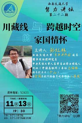 由力学与工程学院主办,力学与工程学院砥力传媒承办的西南交大“努力讲坛”第二十二期在11月13日晚于x2423圆满举行。本期讲坛我们特别邀请到孙红林老师为力学学子分享他与川藏线的故事:川藏线与跨越时空的家国情怀。