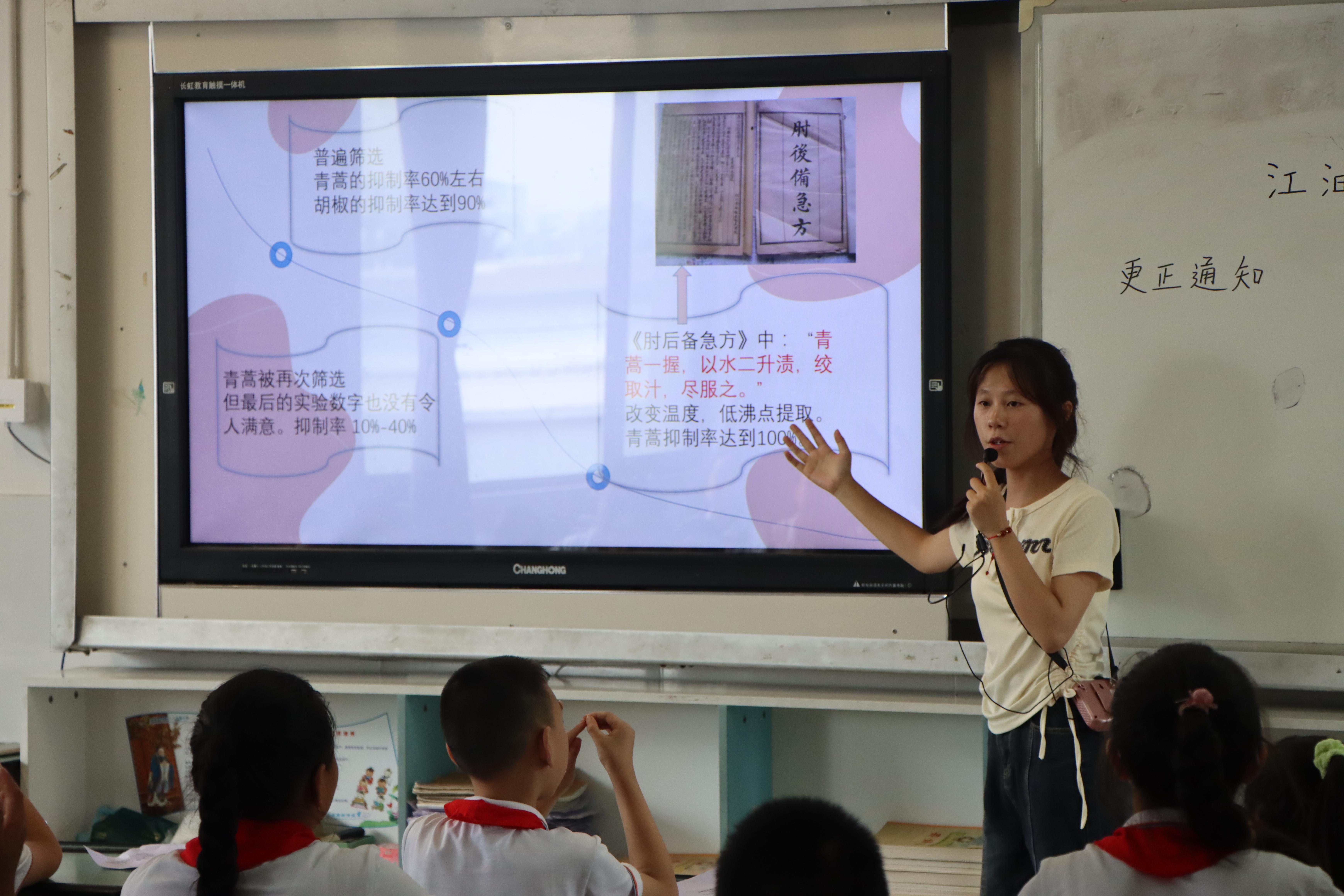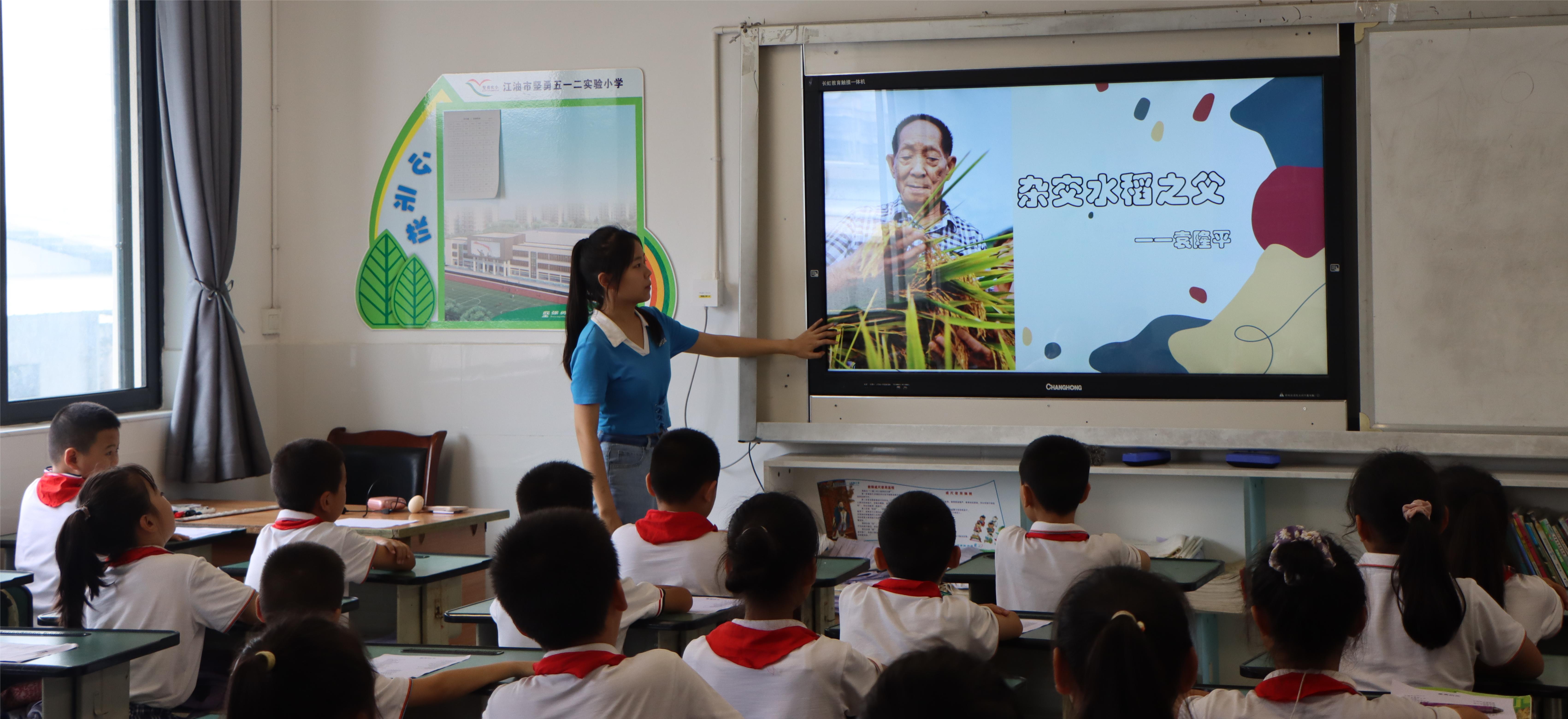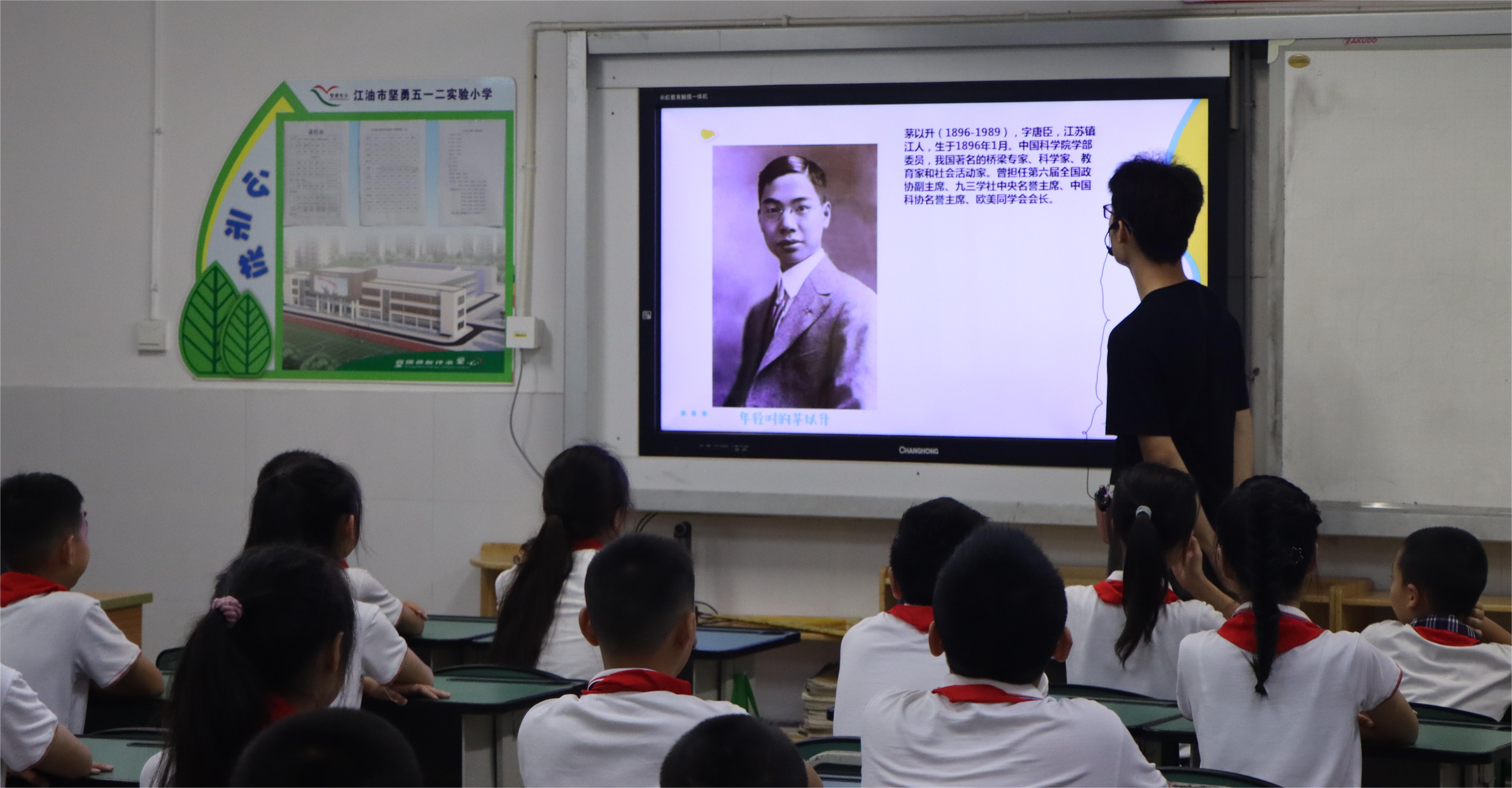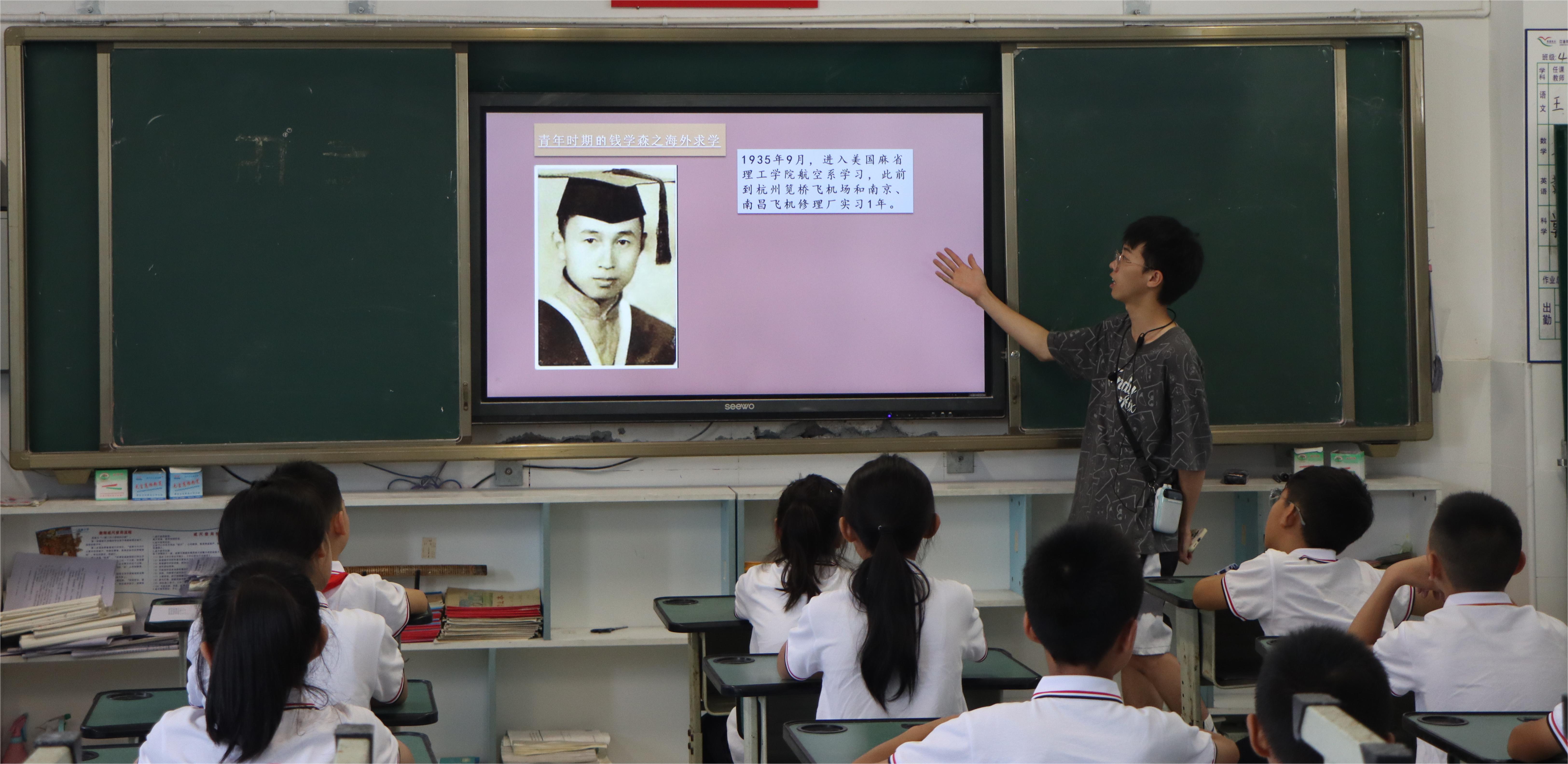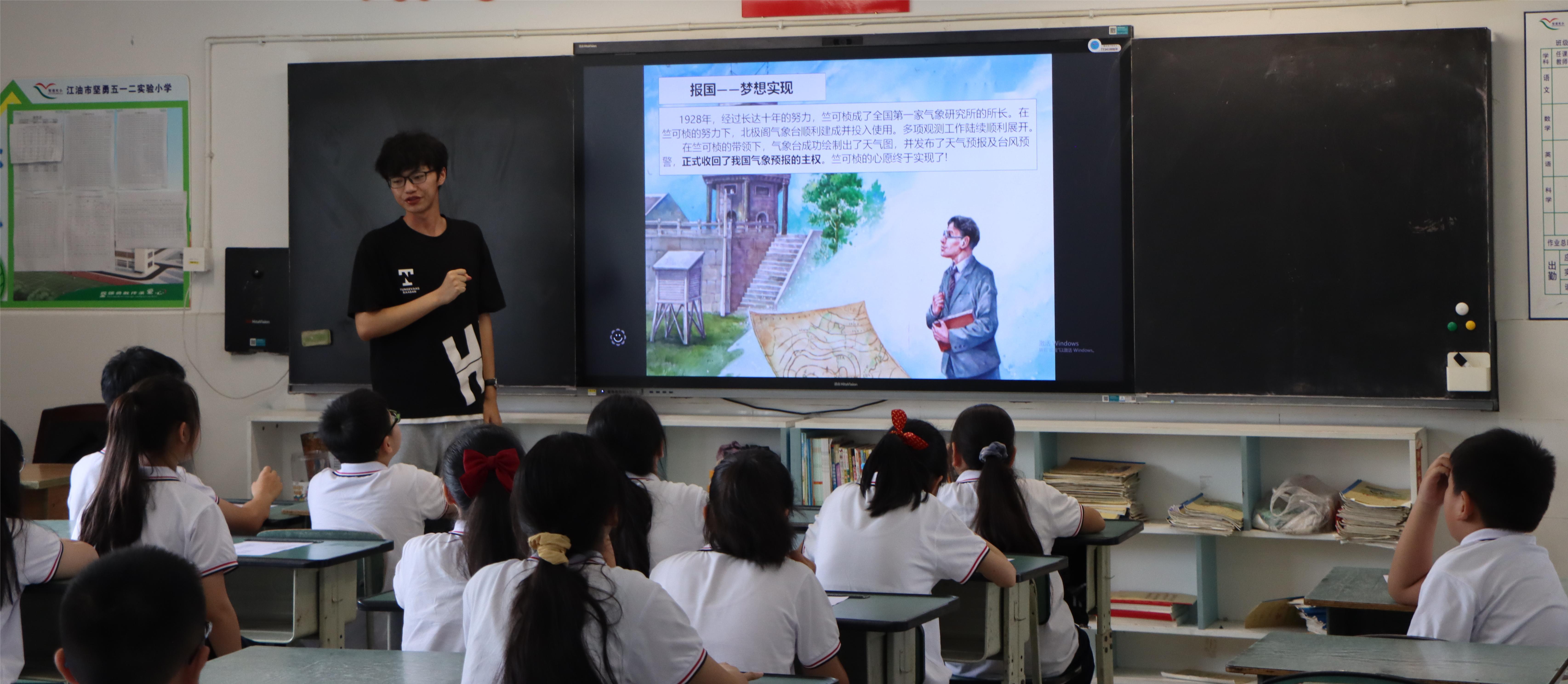 随后,实践队成员以钱学森、茅以升、竺可桢、袁隆平、屠呦呦、黄旭华、顾诵芬七位科学家的生平事迹为主线,用娓娓道来的方式诠释七位科学家在不同时代背景下所实现的成就,以及为国家发展所做出的贡献,浓浓的爱国情怀贯穿其中。孩子们被科学家身上不怕吃苦、勇于探索、赤诚报国的精神所感染,纷纷表示自己以后也要把这些精神体现在学习和生活中,在平凡的生活中做出不平凡的事。