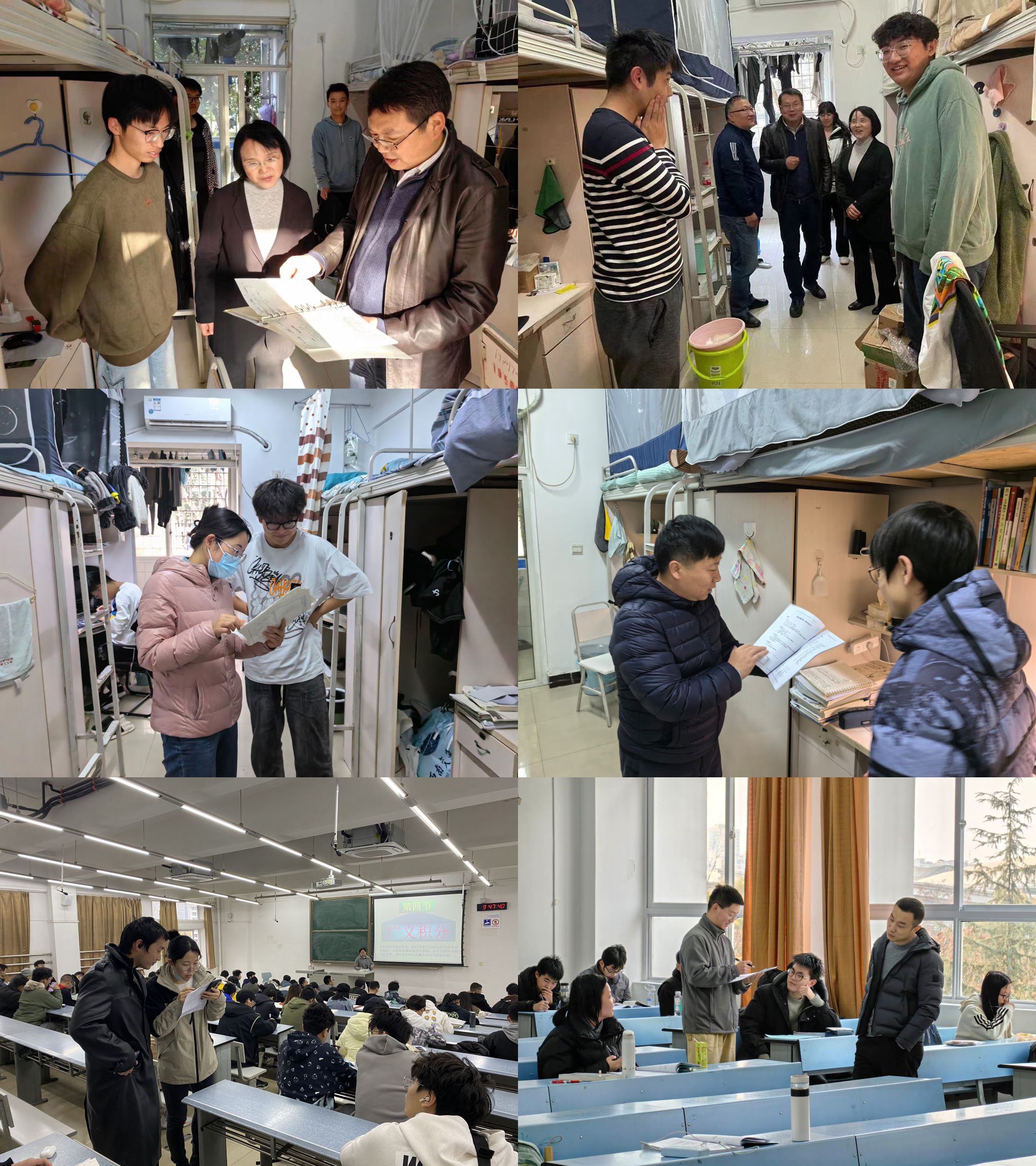 通过“班导师-辅导员”联动,贯彻落实学校党委关于学生工作“7个深入”要求,守好课堂、宿舍两个阵地,建立班导师与辅导员联合深入课堂、深入宿舍工作机制。班导师和辅导员每周共同固定查课1次,不定期开展抽查,确保学生按时参加课堂学习,并积极参与课堂讨论和互动,关注学生的学习进展和困难,提供个性化的学习辅导和指导。同时,他们每周固定查寝1次,前往宿舍了解学生的作息时间、生活习惯等情况,及时解决学生在宿舍生活中遇到的问题,关注学生的心理健康和社交关系,提供必要的心理支持和帮助。班导师和辅导员的联合工作机制促进师生之间的沟通和交流,引导学生增强纪律意识,切实发挥班导师和辅导员在学风引领方面的重要作用,提高学生对学院和学校的的归属感和认同感。