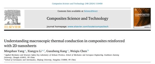 李翔宇教授课题组在二维纳米片增强复合材料的宏观导热性能研究方面取得进展,相关成果以“Understanding macroscopic thermal conduction in composites reinforced with 2D nanosheets”为题发表在国际复合材料领域的顶级期刊《Composites Science and Technology》(中科院一区TOP,IF:9.1)。博士研究生杨名山为第一作者,李翔宇教授为通讯作者,合作作者包括泥视频