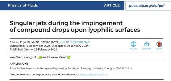 近日,流体力学领域知名期刊《Physics of Fluids》发表了题为“Singular jets during the impingement of compound drops upon lyophilic surfaces”的研究成果。泥视频