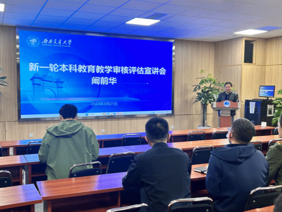 阚前华副院长从本科教育教学审核评估概要、学校评建工作开展情况、迎接新一轮审核评估教师何为、学习资料简介四个方面对新一轮本科教育教学审核评估工作进行了详细传达,特别强调了学院教师、学生在本次评估中的主要工作和任务,希望全院师生提前熟悉宣讲内容,配合学校和学院做好后续相关工作,以饱满的热情和良好的面貌迎接评估、参与评估。