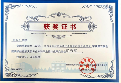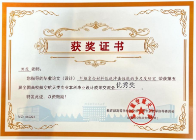 2020级飞行器设计与工程专业本科生谭丽丹的毕业论文“接触点约束下磁控软体导丝机器人的力学模型”(指导教师:杨洋 王柳)荣获二等奖,2020级飞行器设计与工程专业本科生衡雨丹的毕业论文“纤维复合材料低速冲击性能的多尺度研究”(指导教师:刘虎)荣获优秀奖。这是我们院首次获得全国高校航空航天类专业本科毕业设计成果交流会二等奖。