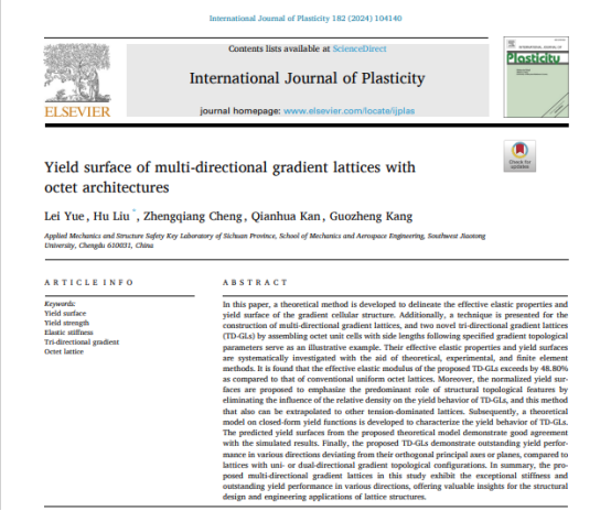 近日,刘虎教授研究小组在轻质结构研究上取得重要进展,相关工作以“Yield surface of multi-directional gradient lattices with octet architectures”为题发表在力学领域期刊《International Journal of Plasticity》(IF:9.4)。泥视频