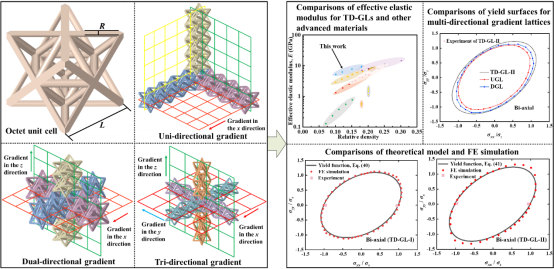 (2)、与均匀octet晶格、单向(UGL)和双向(DGL)梯度octet晶格相比,TD-GLs的有效弹性模量分别提高了48.80 %、33.51 %和22.89 %。此外,TD-GLs在各个方向上都表现出全面增强的屈服性能。综上所述,本研究提出的多向梯度晶格构建方法可以显著提高轻质结构的承载能力和屈服性能。