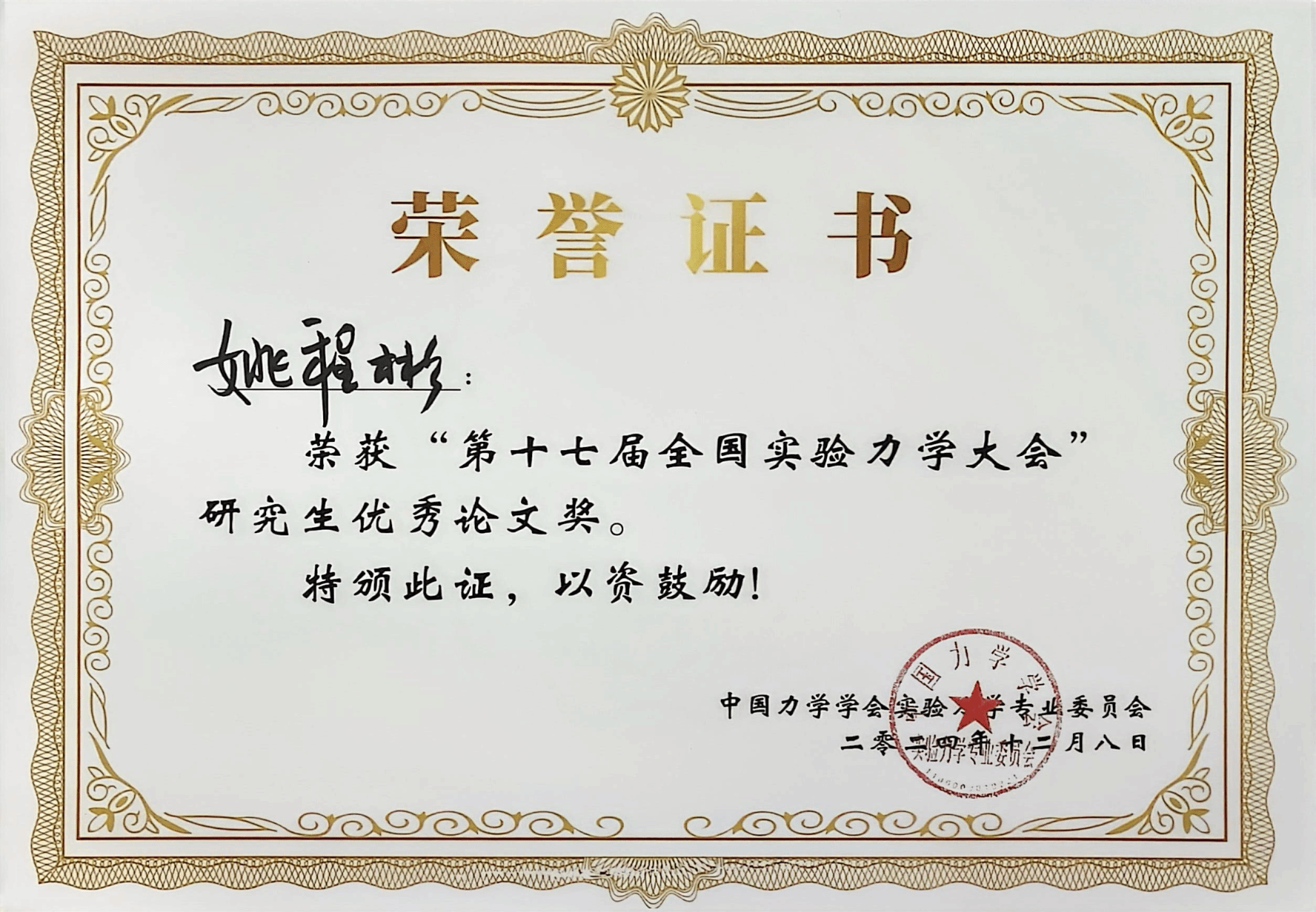 姚程彬博士生获得“第十七届全国实验力学大会”研究生优秀论文奖