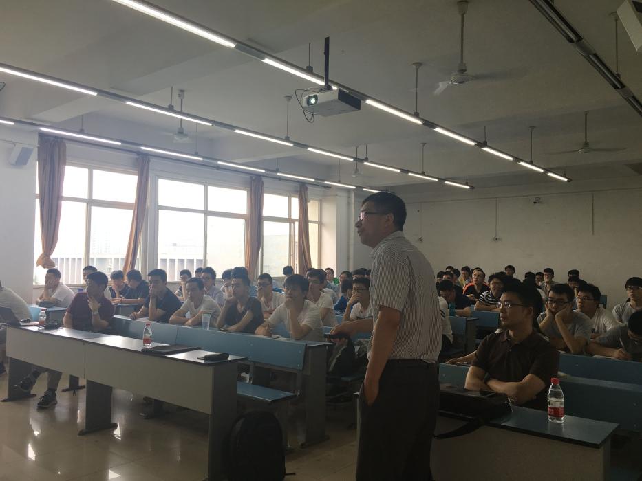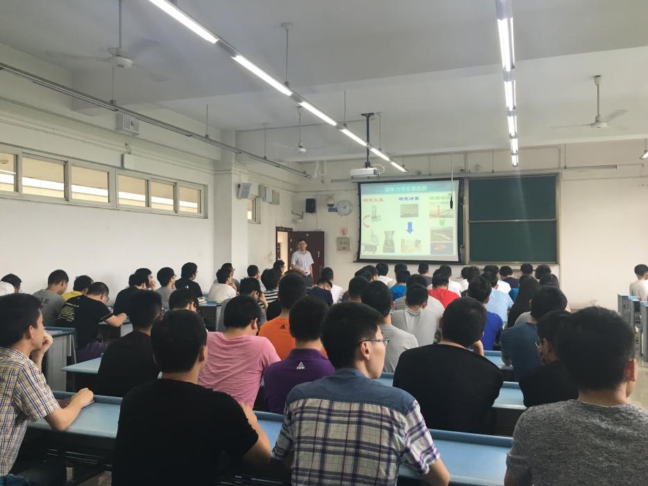 在短暂的休息之后,陈伟球教授向同学们作浙江大学力学学科相关的讲座。陈伟球教授以浙江大学力学学科的历史讲起,介绍了浙大力学的发展。而后介绍了浙大力学学科优秀的师资队伍与研究资源,同时向同学们讲述了人才培养相关的情况,不仅有优秀的师资水平,还有优秀的教材与各方面的资源,毕业生的就业与去向情况良好。再接着,陈老师详述了浙大力学相关科学研究的方向:如微纳米力学、非线性与随机控制、多相流与湍流、水动力学、软物质科学、生物与仿生力学和无人机等。进而是浙大力学在社会服务方面的成果,以及在国际交流方面,与国外各知名高校的交流合作情况。