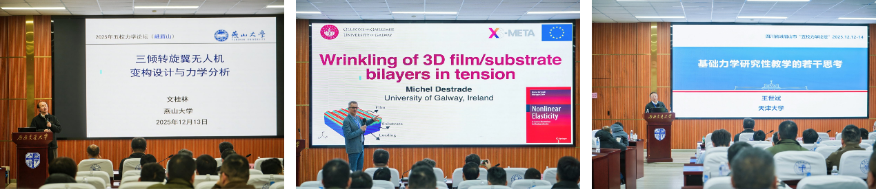 本届论坛设置了大会特邀报告、教学主题研讨和青年学者学术报告等环节。燕山大学文桂林教授和爱尔兰高威大学MichelDestrade教授分别作大会特邀报告,围绕无人机变构动力学、软物质与结构失稳等前沿方向分享最新研究成果。来自五校的多位专家和青年学者围绕非线性动力学、结构安全与振动控制、材料与结构多场耦合行为、计算力学与智能设计等研究方向作学术报告,内容丰富、讨论热烈。