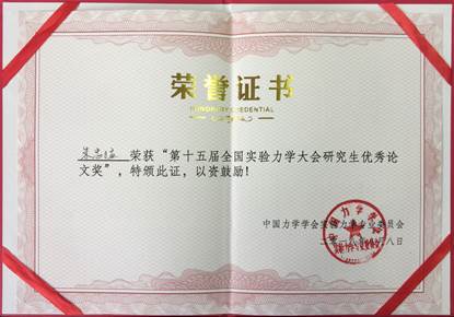 朱忠猛博士从中脱颖而出,获得 “第15届全国实验力学大会研究生优秀论文奖”,这也是自会议创办以来,我校研究生第一次获此殊荣。