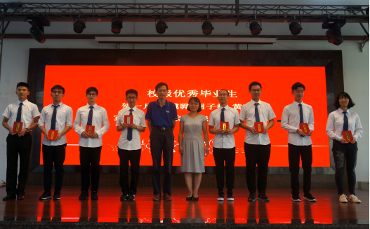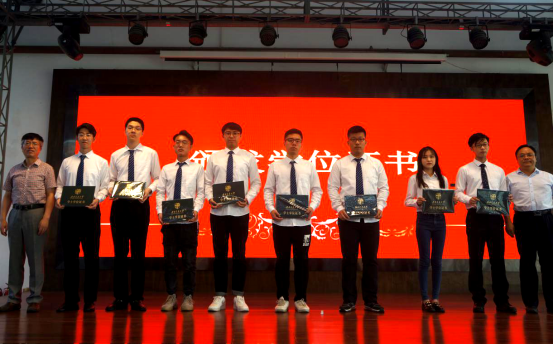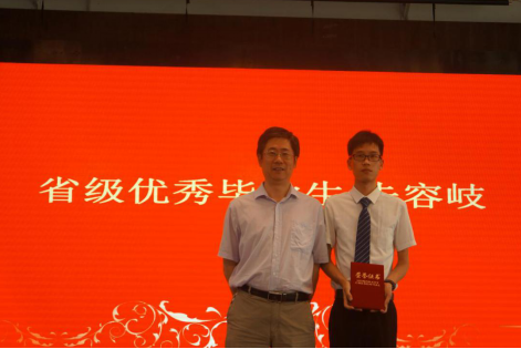 随后,学院党委栗民书记宣读了获得学士学位同学名单。同时,对2019届优秀毕业生进行了表彰,康院长为省级优秀毕业生朱容岐颁发了荣誉证书,栗民书记和金建明老师为校级优秀毕业生代表颁发证书并合影留念。