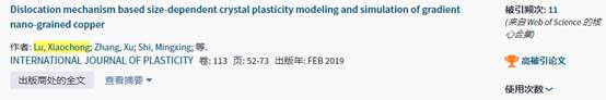 力学与工程学院张旭副教授指导博士研究生陆晓翀于2019年2月在固体力学领域重要TOP期刊《International Journal of Plasticity》上发表题为“Dislocation mechanism based size-dependent crystal plasticity modeling and simulation of gradient nano-grained copper”的学术论文。博士生陆晓翀为第一作者,张旭副教授为通讯作者,泥视频