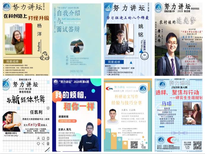 在学院党员砥力先锋队的带领下,青协、学生会、研究生会、传媒等学生组织全面参与,系统构建了“努力讲坛”寒假网络版。从131日开始每周两期举办QQ群讲座,邀请学校优秀教师、竢实扬华奖章获得者、十佳班长、科创大神等给同学们带来满满的知识干货,每期讲座结束后由党员服务队的同学整理每期讲座实录文稿,方便更多人学习交流。目前已成功开展7期讲座,学习人数已高达1600多人,无数学生纷纷留言解疑,不仅有本校的本科生、硕博生,还吸引了武汉大学、华中科大、武汉理工、四川大学、北京交大、燕山大学、合肥工大、海南大学、东北电力、桂林理工、青岛农大等全国其他学校的学生,甚至还有高中生闻名而来。“努力讲坛”寒假网络版深受师生欢迎,形成了一套完整的工作体系,获得教育部“高校辅导员在线”的报道。同时,拓宽讲座规模,积极与信息学院、材料学院、外语学院、数学学院、牵引动力国家重点实验室等其他学院合作,给因为疫情在家的同学们送上了一顿顿知识盛宴。