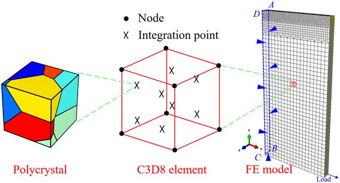 由于梯度纳米结构TWIP钢的微结构十分复杂,晶粒数目众多,通过采用三维均匀化方法,建立了宏观试样尺寸的有限元模型。通过对每层单元赋予不同的晶粒尺寸,初始位错密度和孪晶体积分数,离散地描述材料内部微结构的梯度分布,并通过梯度网格划分方法进一步减少单元数目。对于材料表层微结构变化剧烈的区域,采用密度较高的网格,以保证更加精确地描述微结构的梯度变化。