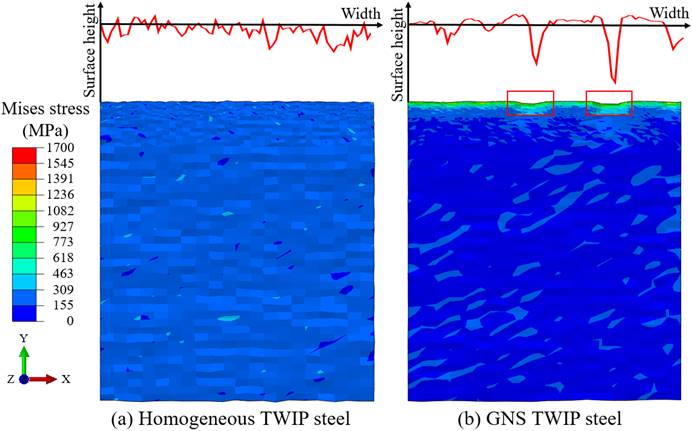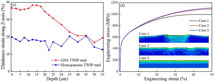 图4 均匀结构和梯度纳米结构TWIP钢的模拟结果对比分析