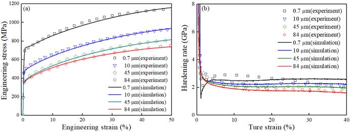 图2 对比不同晶粒尺寸TWIP钢的单拉实验和模拟结果