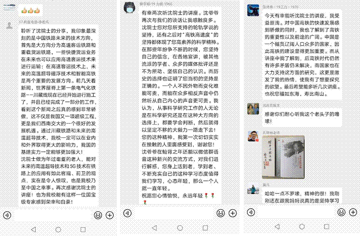 同学们纷纷表示听完沈院士的讲座,受益匪浅,对中国高铁的快速发展感到骄傲,同时,也了解到了轨道交通发展的重要性以及前途的广阔,未来会不断学习、充实自己,希望他日学成,能够在不同的领域贡献自己的一份力量。