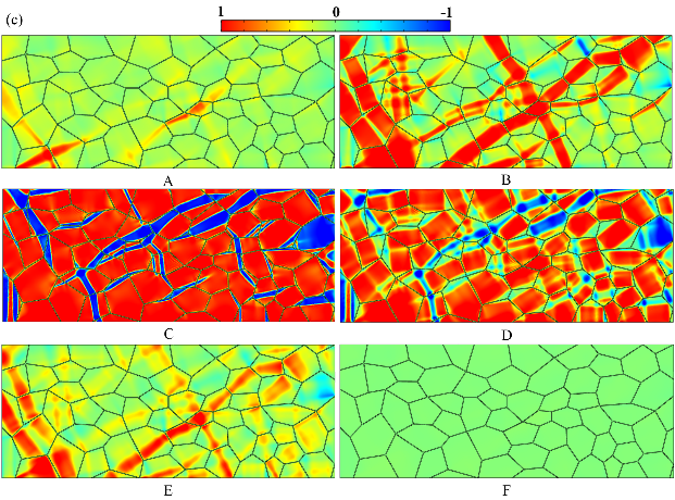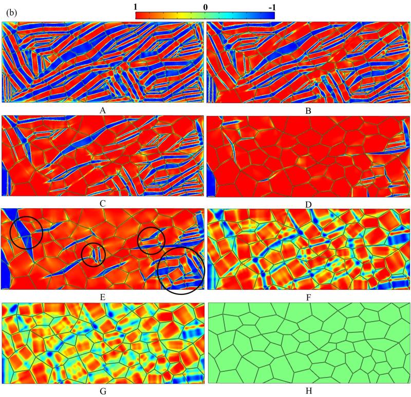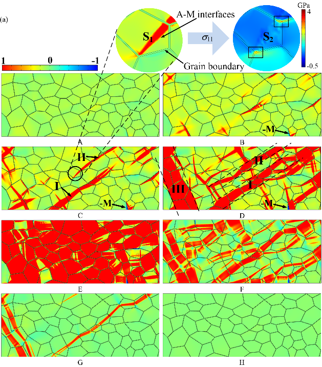 图3 较粗晶粒的纳米多晶NiTi SMA超弹性,单程和双程形状记忆过程中的微结构演化相场模拟结果