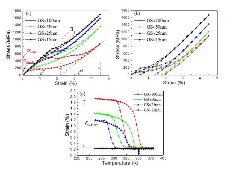 与已有文献相比,本文全面报道了纳米多晶NiTi合金的超弹性,单程和双程形状记忆效应的晶粒尺寸依赖性,充分揭示了这种晶粒尺寸依赖性的微观机制。本文的研究成果可以为采用晶粒细化法制备具有优良热-机械性能的NiTi SMA器件提供重要参考。