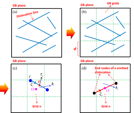 康国政教授团队多尺度力学研究组发表在Acta Materialia上的研究工作,在三维离散位错动力学-有限元耦合框架中,采用“粗粒化”的思想,建立了考虑晶界吸收位错和晶界发射位错两种机制的位错-晶界交互作用模型。几何上,晶界面被划分成大小相等的网格。物理上,在晶界吸收位错和晶界发射位错阶段,每个网格可分别视为一个“位错汇”和“位错源”。本构准则方面,位错被晶界吸收的临界应力(晶界强度)通过分子动力学模拟确定,位错发射需考虑几何条件和应力条件。通过上述处理,该晶界模型可以有效地处理任意晶界取向差下位错与晶界的交互作用。