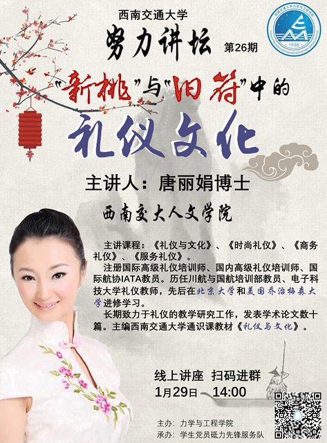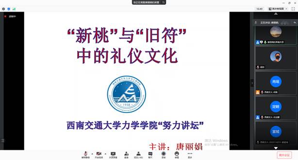 礼仪不仅仅能让我们生活更加丰富,还是表现一个人的待人之道与文化素养的基本准则。由力学与工程学院主办,学生党员砥力先锋队承办的“努力讲坛”第26期于2021年1月29日下午两点顺利在线上举行。本期讲坛由泥视频