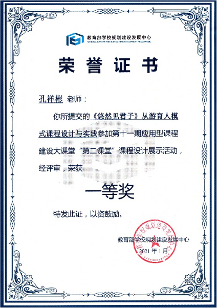 会议最后,举行了教育部第二课堂课程设计展示活动颁奖仪式。该展示活动于20201216日在线上举行,孔祥彬老师以“<悠然见君子>从游育人模式课程设计与实践”为题进行了展示,获得评委一致好评,荣获一等奖。会议现场,教育部学校规划建设发展中心课程中心秘书长张振笋为孔老师颁发了证书。