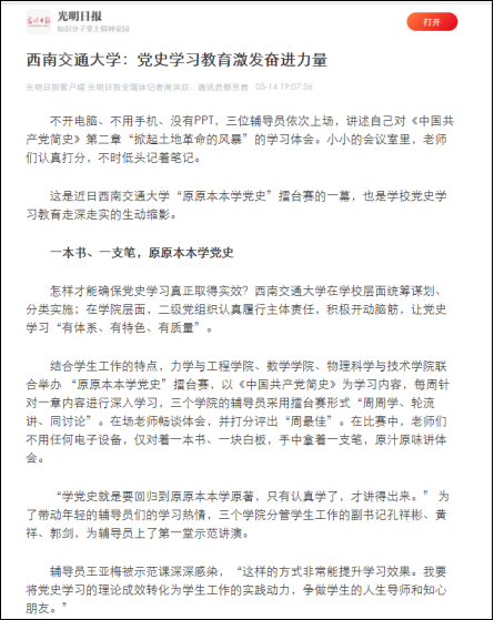 5月14日,《光明日报》以《泥视频 :党史学习教育激发奋进力量》为题,报道了力学学院联合数学、物理学院开展的“原原本本学党史”辅导员党史学习教育擂台赛的创新做法。