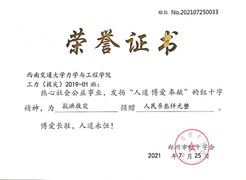 力学与工程学院19级力学拔尖班积极响应国家号召,在7月21日郑州市红十字协会公开接受社会抗洪救灾方式当天,他们决定将去年先进班集体所获3000元奖金全部捐献,用于抗洪救灾,八方携手,共度难关,为河南洪灾贡献自己的一份绵薄之力。