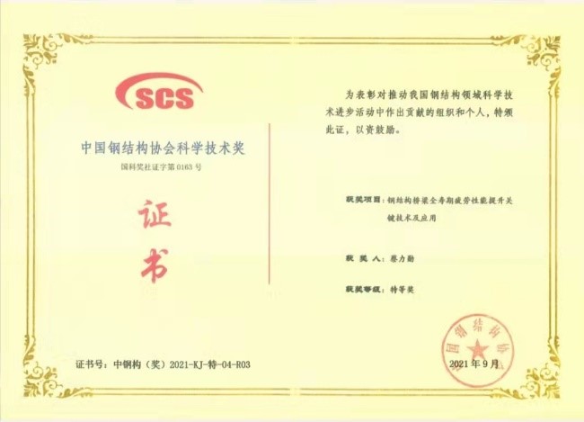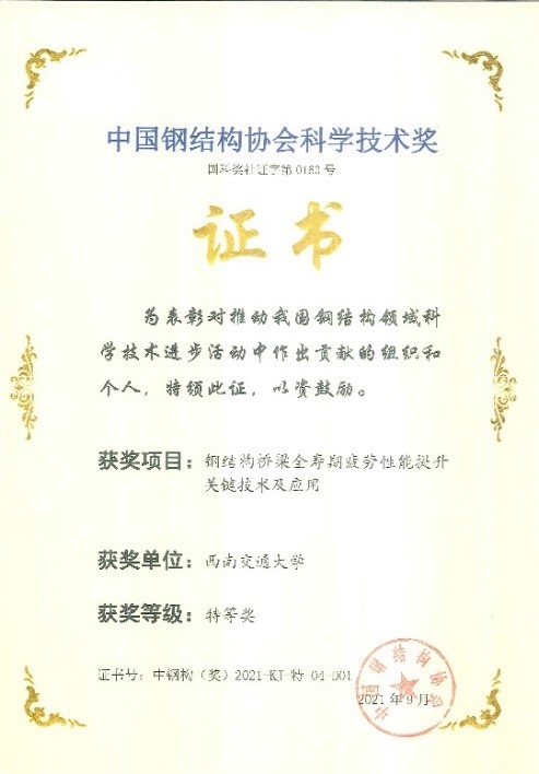 蔡力勋教授与土木工程学院张清华教授团队合作完成的《钢结构桥梁全寿命疲劳性能提升关键技术及应用》项目荣获特等奖,蔡力勋教授排名第3。