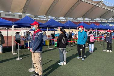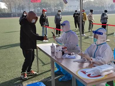 迅速到达现场后,志愿者们由校团委郑源老师和疾控部门负责人进行了快速培训,然后在孔祥彬老师、周子涵老师的组织下快速进行了分工,5名志愿者换上全身防护服,在检测点位协助医务工作者进行核酸检测工作,一部分同学负责引导同学们完成核酸检测准备工作并进行登记,一部分志愿者引导完成检测的同学们迅速有序离开场地,维持场地的秩序。