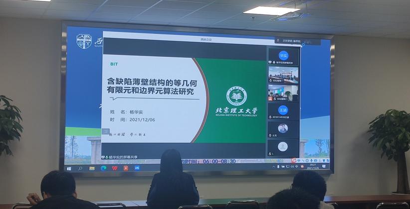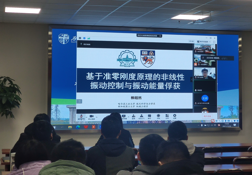 揭牌仪式系列活动之一,采用了线上和线下结合的模式。论坛邀请到了三位优秀学者做学术报告,其中包括来自哈尔滨工业大学的柳超然博士,其报告题目为“基于准零刚度原理的非线性振动控制与振动能量俘获”,来自浙江大学的侯旭博士,其报告题目为“铁电材料电卡性能的力学和结构调控”,最后一位是来自北京理工大学的杨华实博士,其报告题目为“含缺陷薄壁结构的等几何有限元和边界元算法研究”,线上论坛有多名海内外学者和学院师生参会,线下论坛邀请了泥视频