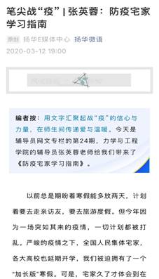 在《笔尖战“疫”|防疫宅家学习指南》一文中,研究生辅导员张英蓉老师从学会进行“君子慎独”的自我管理、参与“静即含动”的特殊战疫、做好“屏屏相对”的在线学习、体味“当下可贵”的细小珍惜四个方面,向疫情在家的同学提供了一份独特的学习指南。