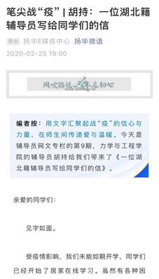 在《笔尖战“疫”|一位湖北籍辅导员写给同学们的信》一文中,本科生辅导员胡持老师从一名青年党员的身份出发,结合自己身处湖北疫情区的所思所想,用一封信的形式与广大学生对话,希望大家坚定信心相信伟大祖国、保持理智分辨多方消息,充满冀望调解良好心态,以人为鉴共度非常难关。