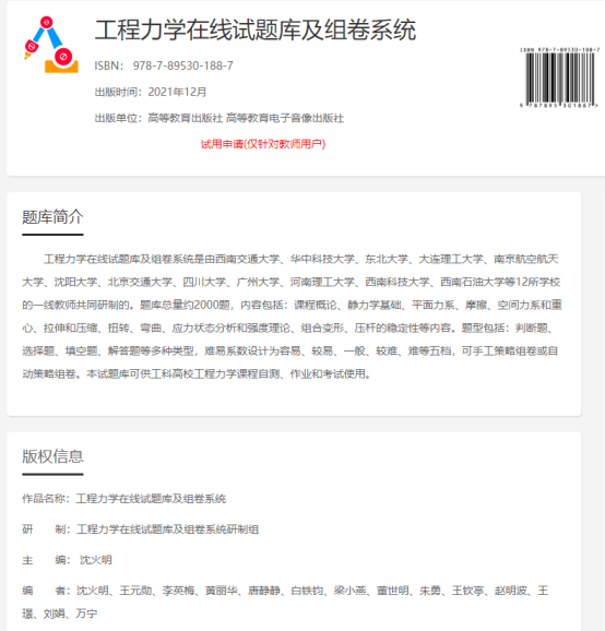 沈火明教授主编的《工程力学在线试题库及组卷系统》由高等教育出版社正式出版。