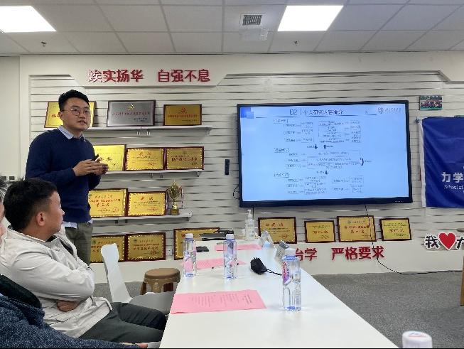 阚前华老师团队的徐祥博士以“科研苦与乐”为主题,首先向大家介绍了其所在团队及个人情况,其次分享了自己科研的心路历程和实验、理论、有限元等方向的科研心得。分享内容丰富且实用,给在场的各研究生同学提供了十分有价值的参考。最后,徐祥博士强调,在科研进展较难时要及时调整心态,在攻坚难题时也要做一些容易出成果的研究。