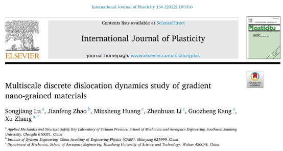 [2] S. Lu, J. Zhao, M. Huang, Z. Li, G. Kang, X. Zhang*, Multiscale discrete dislocation dynamics study of gradient nano-grained materials, International Journal of Plasticity.156 (2022) 103356. (//doi.org/10.1016/j.ijplas.2022.103356)