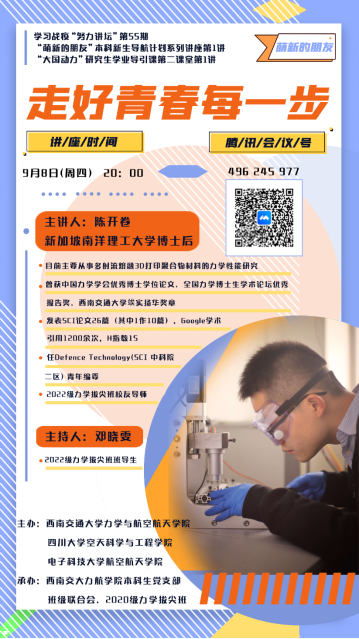 三是启动学习战疫“努力讲坛”工作,由本科生党支部带领新生各班级邀请班级校友导师进行线上学习经验分享。9月8日,学院将联合四川大学空天学院和电子科大航院进行本研新生入学教育讲座。近期,学院还将联合材料学院举行研究生学术沙龙。