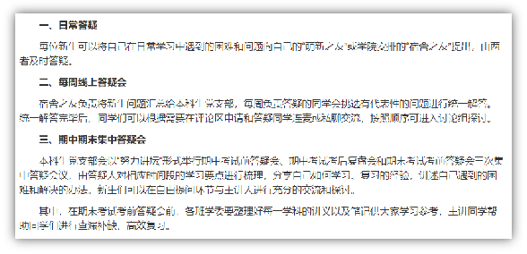 二是启动课程答疑活动。学院通过深入走访新生宿舍,了解到同学们在高数、线代学习方面存在一定困难,经学院党委研究,结合学院党委“先锋力”行动计划和“萌新的朋友”2022级新生导航计划,决定由本科生党支部面向2022级新生组织开展“萌新的朋友”答疑会(高数、线代)活动(包括日常答疑、每周答疑和期中期末答疑),为后续力学课程学习打好基础。