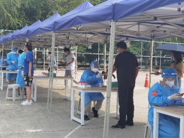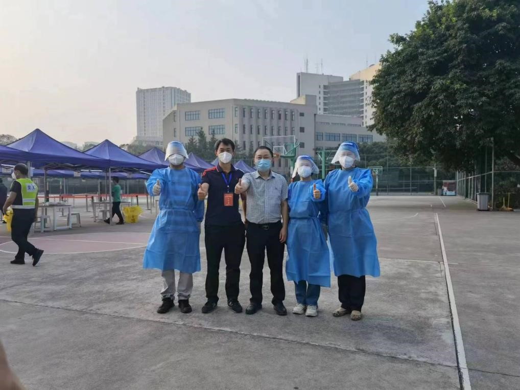 高芳清副院长,鲁丽、张娟、刘金铃、李鹏等5位教师党员到达九里校区篮球场,投入到当天核酸检测志愿服务工作中,负责核酸检测信息录入工作。身披蓝卦,头佩面罩,从教师志愿者到疫情守卫者,他们迅速完成了角色的转换。
