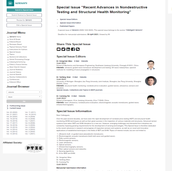 此外,苗鸿臣副教授还应邀担任《Sensors》期刊(2021年影响因子为3.847)的客座编辑(Guest Editor),与西安交通大学的裴翠祥副教授和上海交通大学的申岩峰副教授共同负责“无损检测和结构健康监测领域传感器研究的最新进展(Recent Advances in Nondestructive Testing and Structural Health Monitoring)”专题的组稿与评审工作。该专题的网址如下://www.mdpi.com/journal/sensors/special_issues/RMUA4Z6I8Q。
