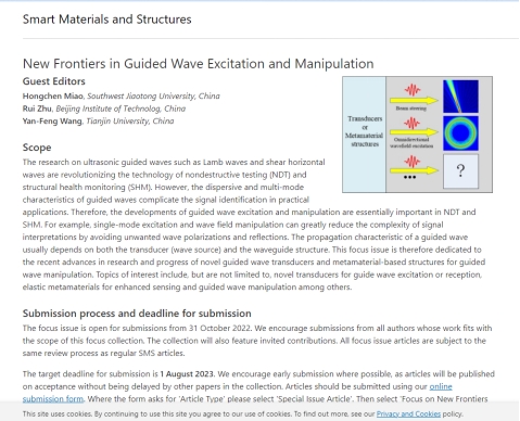 近年来,苗鸿臣副教授在国家自然科学基金重大项目、面上项目和中国科协青年人才托举工程等项目的支持下,以高速铁路智慧运维为牵引,在基于超声导波的结构健康监测领域取得了一些有意义的成果。受邀担任国际期刊客座编辑是对苗鸿臣副教授的研究成果在一定程度上的认可,也有利于进一步增强我校在该领域的国际影响力。